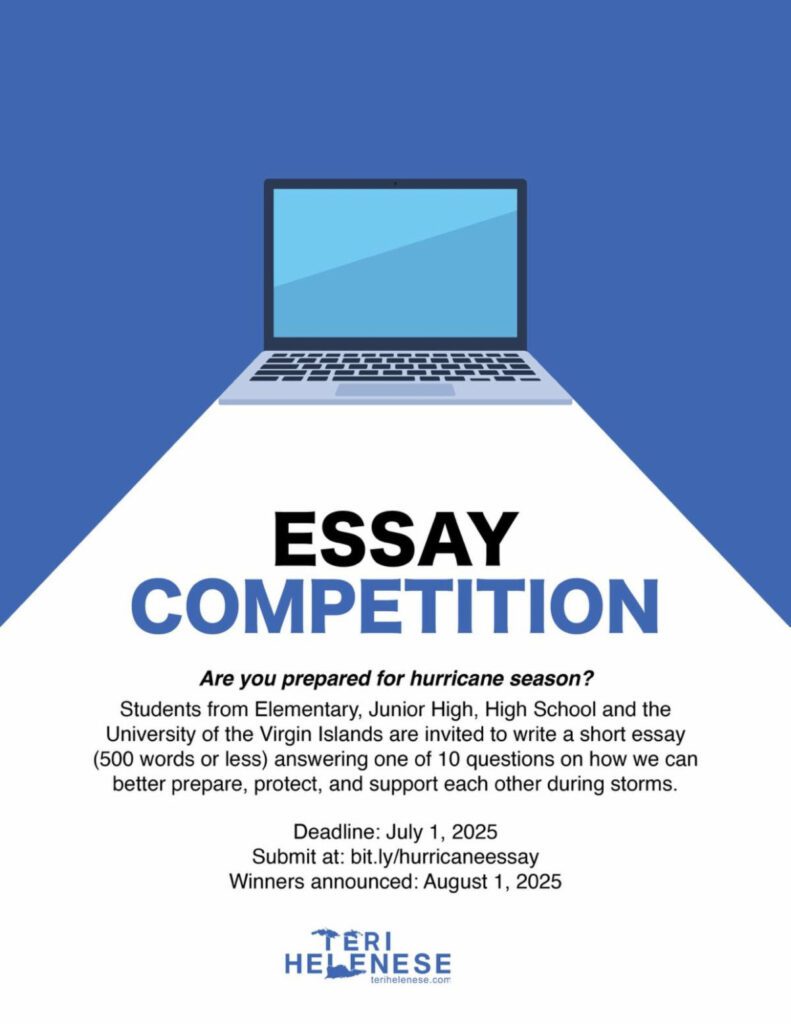 Elementary, junior high, high school, and University of the Virgin Islands (UVI) students are invited to submit an essay of 500 words or less responding to one of 10 hurricane-related questions. Essays must be submitted in PDF format by July 1, 2025, to https://bit.ly/hurricaneessay. All entries must reflect the USVI experience and be the original work of the submitting student.