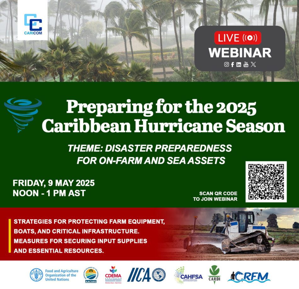 With the hurricane season rapidly approaching, the CARICOM Secretariat will host a one-hour webinar every Friday—from 9 May to 6 June 2025—aimed at strengthening the preparedness of the agriculture sector of the Region. The event will be carried across all of the Secretariat’s online platforms.