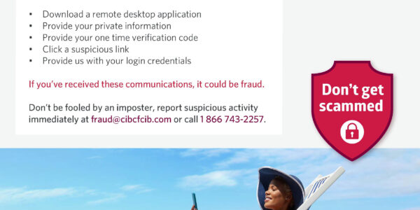 If you’ve received these communications, it could be fraud Don’t be fooled by an imposter, report suspicious activity immediately at [email protected] or call 1 866 743-2257.
