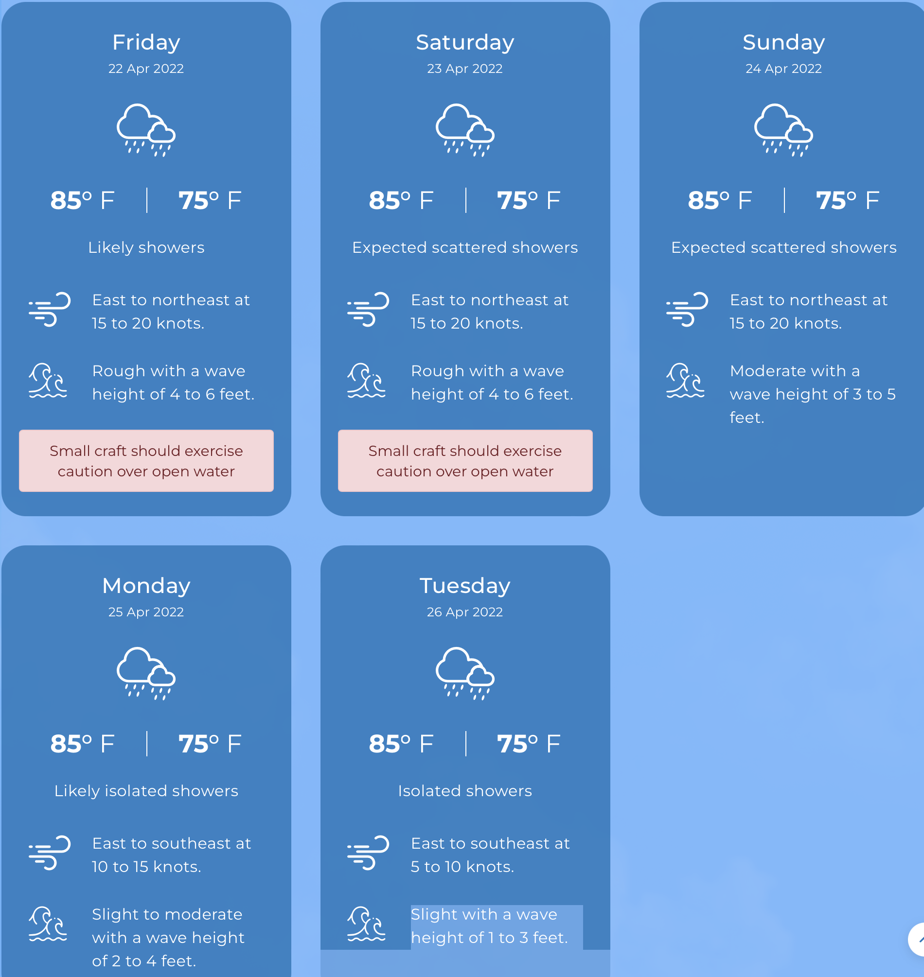 Today: Windy with a mix of clouds and sun. Tonight: Mostly clear skies this evening. Scattered showers and thunderstorms developing overnight. Sea: Rough with a wave height of 4 to 6 feet. Small craft should exercise caution over open water.
