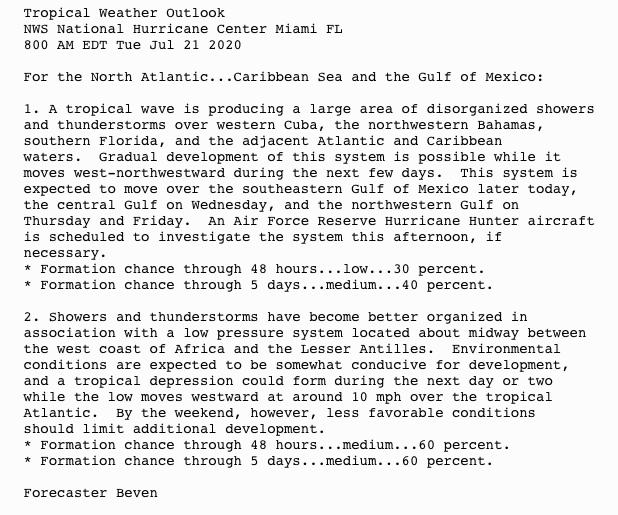 | Tropical Weather Outlook (en Español*) 800 AM EDT Tue Jul 21 2020 |