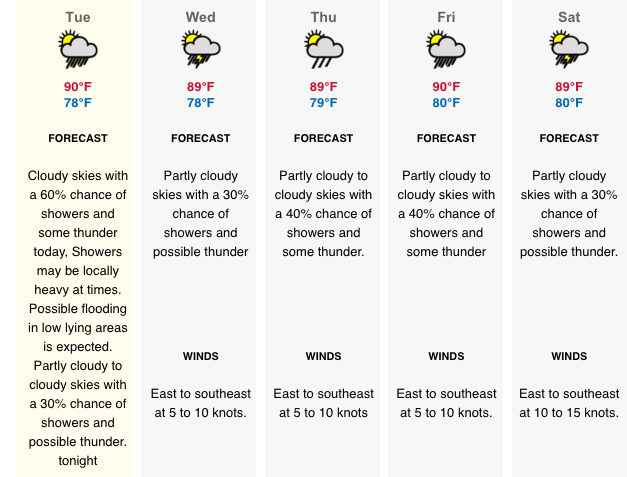 Temperature: Today’s expected temperatures – 77° to 90°F. Yesterday: H 89.2°F L 76.7°F