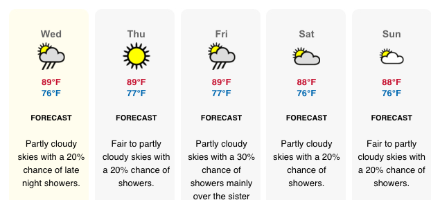Temperature: Today’s expected temperatures – 79°F to 89°F. Yesterday: H 89.5°F L 81,3°F