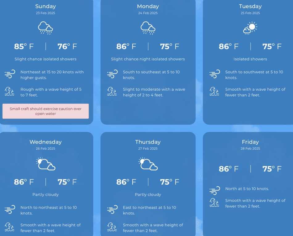 Expected temperatures: 76°F to 84°F. Yesterday: H 86.0°F L 75.7°F