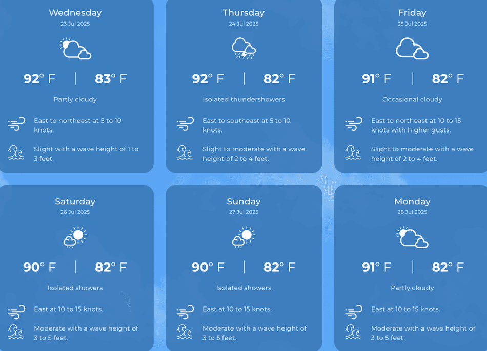 Expected temperatures: 83°F to 92°F. Yesterday: H 91.5°F L 83.2°F