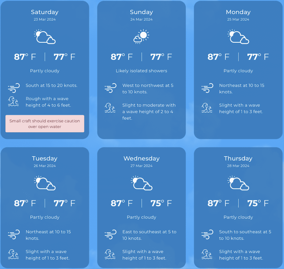 IMPORTANT NOTICEThe times reflected in the tidal table for Grand Cayman are predictions valid as references for sports fishing in areas near the coast of Grand Cayman. THEY ARE NOT SUITABLE FOR NAVIGATION. Remember that to practice any activity at sea like diving, windsurfing and fishing from a boat or underwater fishing should always be consulted with the official tide tables of the port of Grand Cayman.