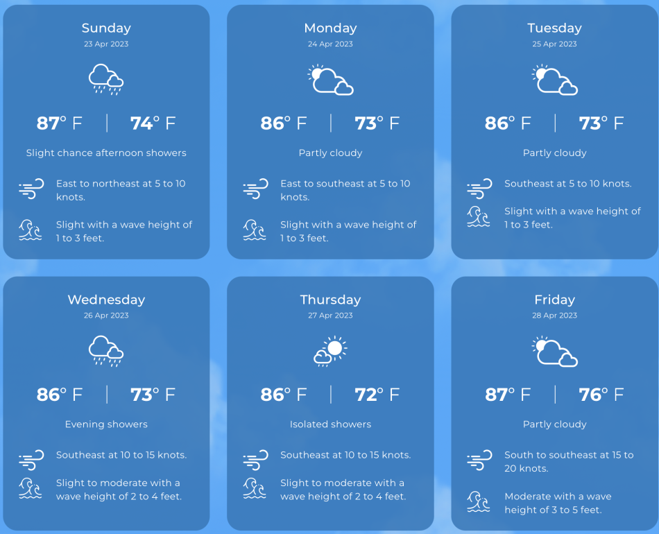 Temperatures: Yesterday – Low 78.2°F, High 88.3°F Today (Expected) – Low 79°F High 87°F