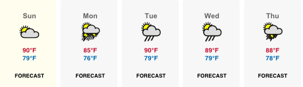 Temperature: Today’s expected temperatures – 78° to 91°F. Yesterday: H 91.2°F L 76.3F