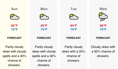 Temperature: Today’s expected temperatures – 73°F to 82°F. Yesterday: H 79.9°F L 74.7°F