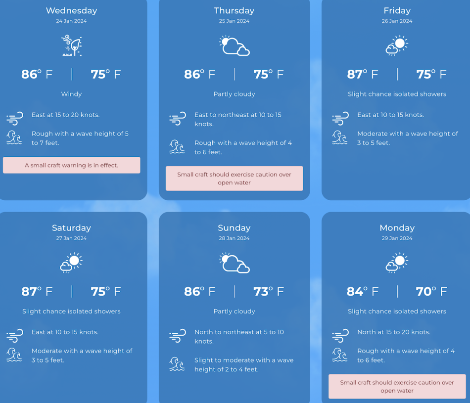 Sea: Rough with a wave height of 6 to 8 feet. A small craft warning is in effect.