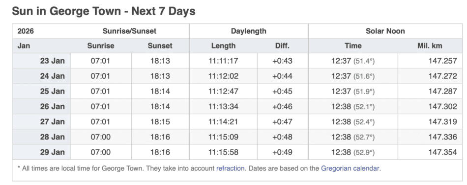 IMPORTANT NOTICEThe times reflected in the tidal table for Grand Cayman are predictions valid as references for sports fishing in areas near the coast of Grand Cayman. THEY ARE NOT SUITABLE FOR NAVIGATION. Remember that to practice any activity at sea like diving, windsurfing and fishing from a boat or underwater fishing should always be consulted with the official tidetables of the port of Grand Cayman.