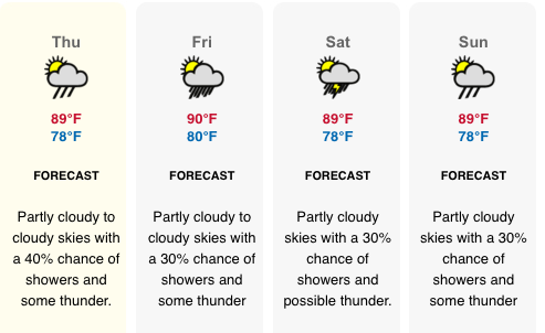 Temperature: Today’s expected temperatures – 80° to 92°F. Yesterday: H 92.8°F L 77.7°F