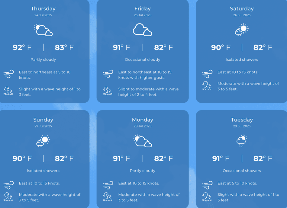 Expected temperatures: 83°F to 92°F. Yesterday: H 91.7°F  L 83.4°F