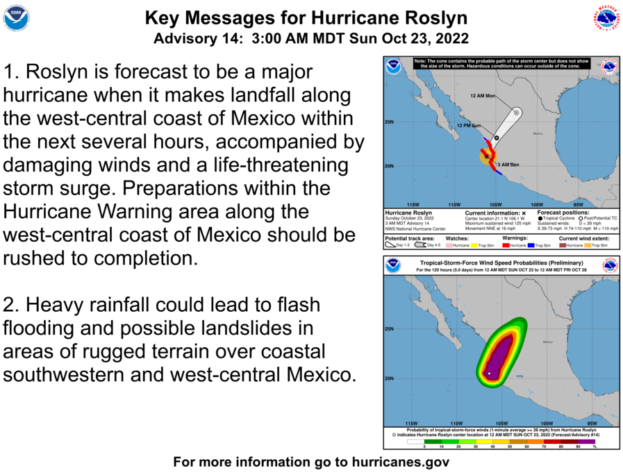 HURRICANE ROSLYN EXPECTED TO DELIVER DAMAGING WINDS, A LIFE-THREATENING STORM SURGE AND FLOODING RAINS TO PORTIONS OF WEST-CENTRAL MEXICO SOON