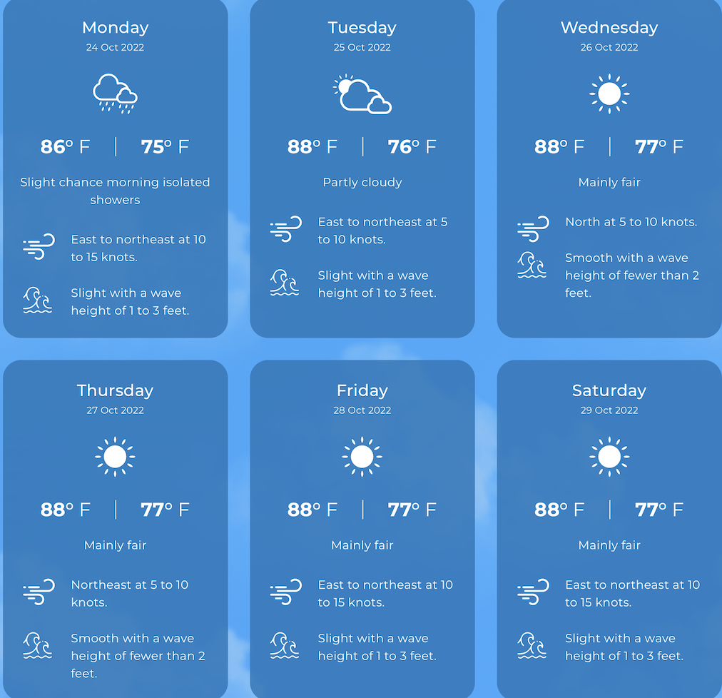 IMPORTANT NOTICEThe times reflected in the tidal table for Grand Cayman are predictions valid as references for sports fishing in areas near the coast of Grand Cayman. THEY ARE NOT SUITABLE FOR NAVIGATION. Remember that to practice any activity at sea like diving, windsurfing and fishing from a boat or underwater fishing should always be consulted with the official tide tables of the port of Grand Cayman.