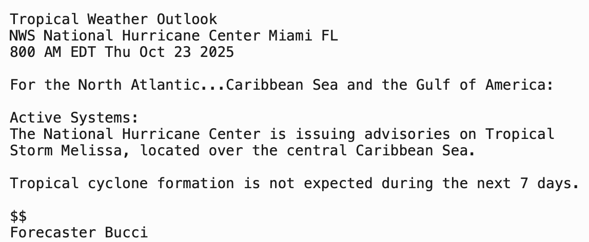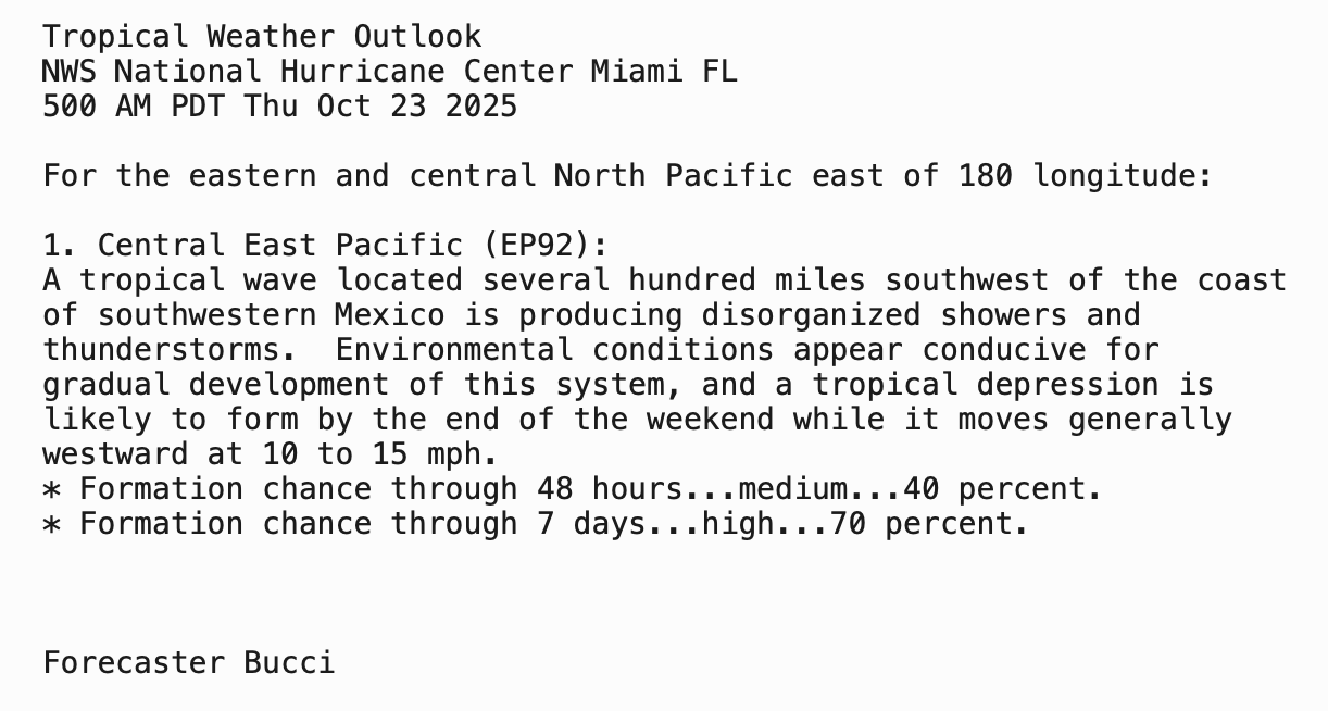 | Tropical Weather Outlook 800 AM EDT Thu 23 Oct 2025 1205 UTC Thu 23 Oct 2025 | |