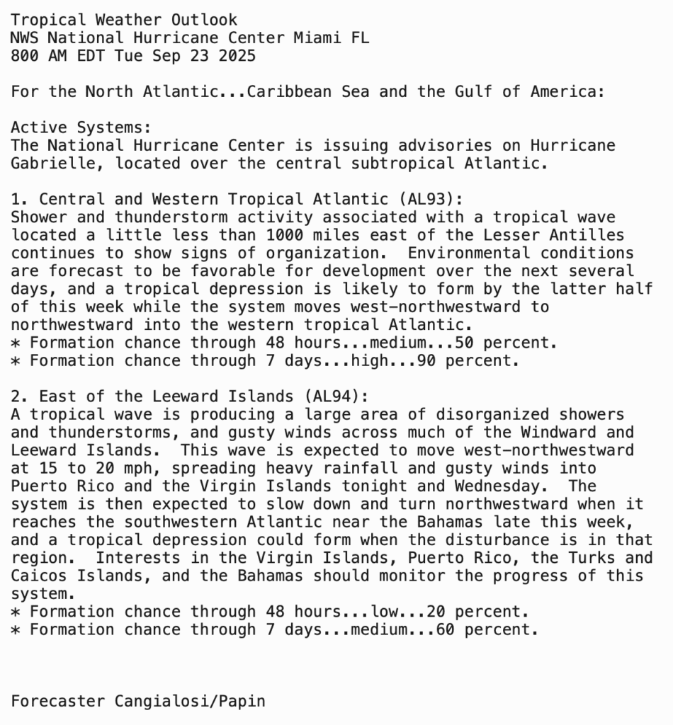 | Tropical Weather Outlook 800 AM EDT Tue 23 Sep 2025 1205 UTC Tue 23 Sep 2025 | |