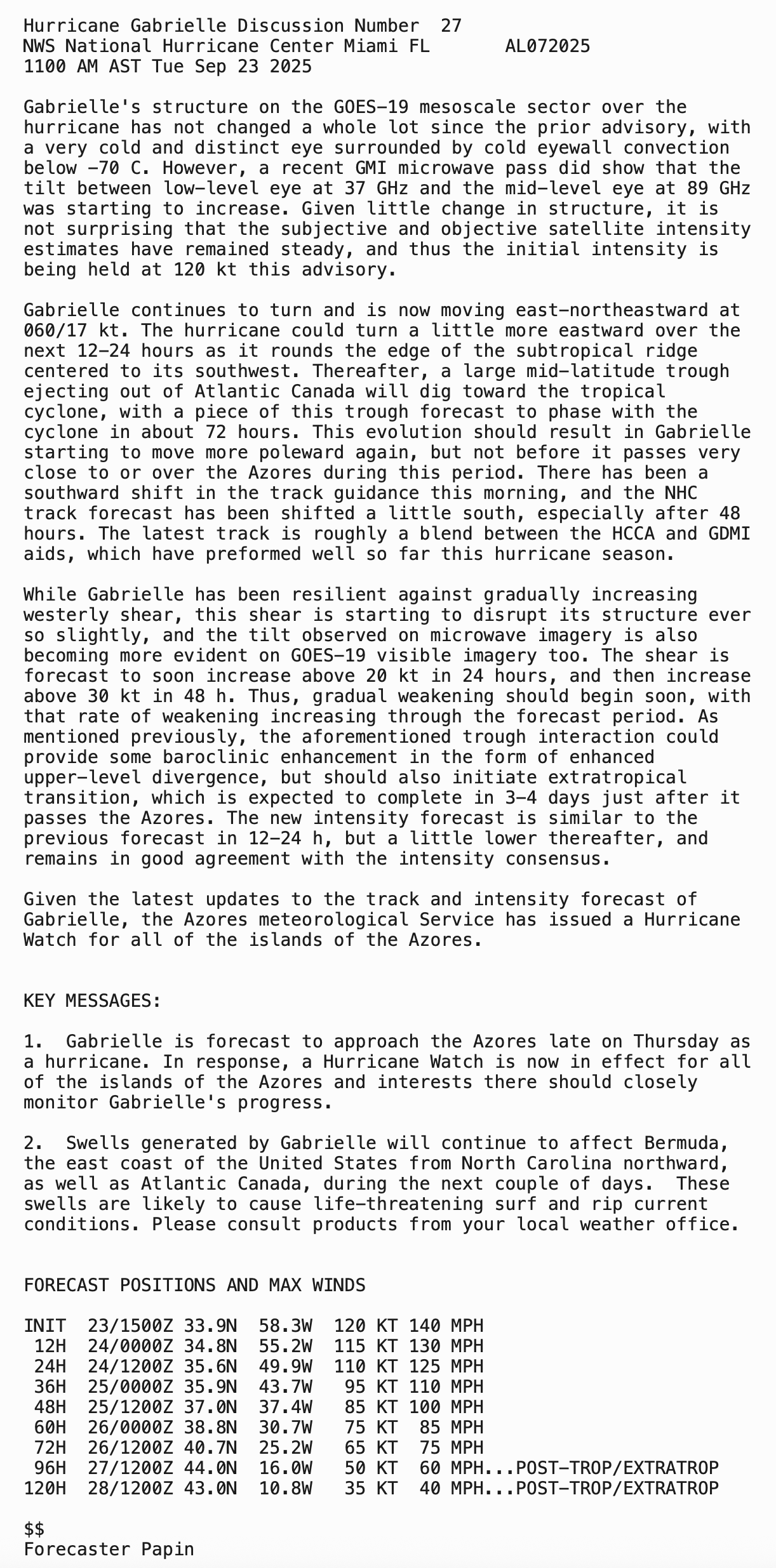GABRIELLE MOVING NORTHEASTWARD INTO THE OPEN CENTRAL ATLANTIC… …INTERESTS IN THE AZORES SHOULD MONITOR ITS PROGRESS