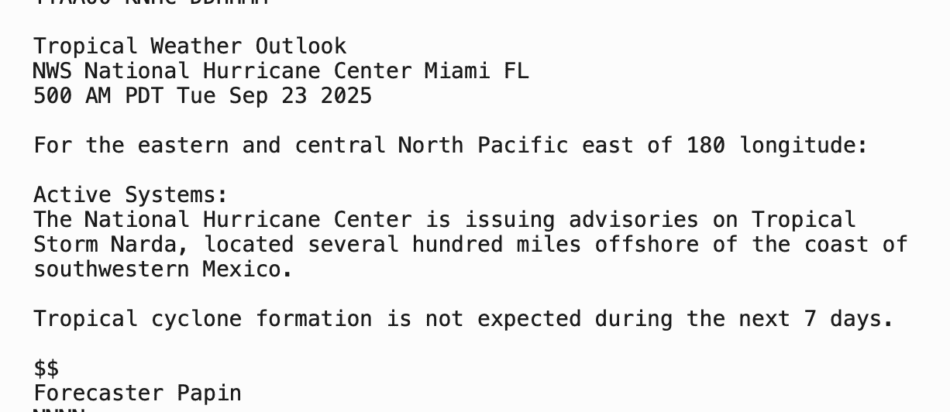 | Tropical Weather Outlook 500 AM PDT Tue 23 Sep 2025 1005 UTC Tue 23 Sep 2025 | |