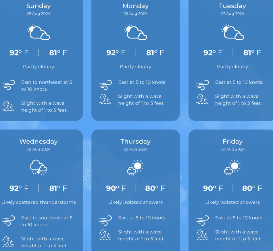 Take precautions by covering up, and wearing a hat, sunglasses and sunscreen, especially if you will be outside for 30 minutes or more. Look for shade near midday when the sun is strongest.Expected temperatures: 81°F to 91°F. Yesterday: H 91.5°F L 81.3°F