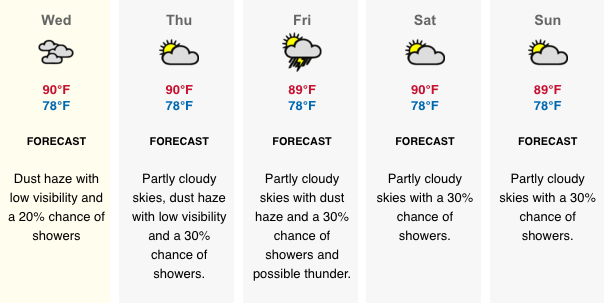 Temperature: Today’s expected temperatures – 82° to 91°F. Yesterday: H 92.5°F L 80.4°F