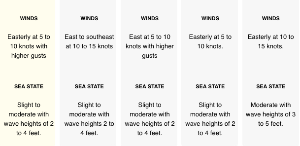 Winds: Today: ENE 10-20 mph Tonight: E 10-15 mph