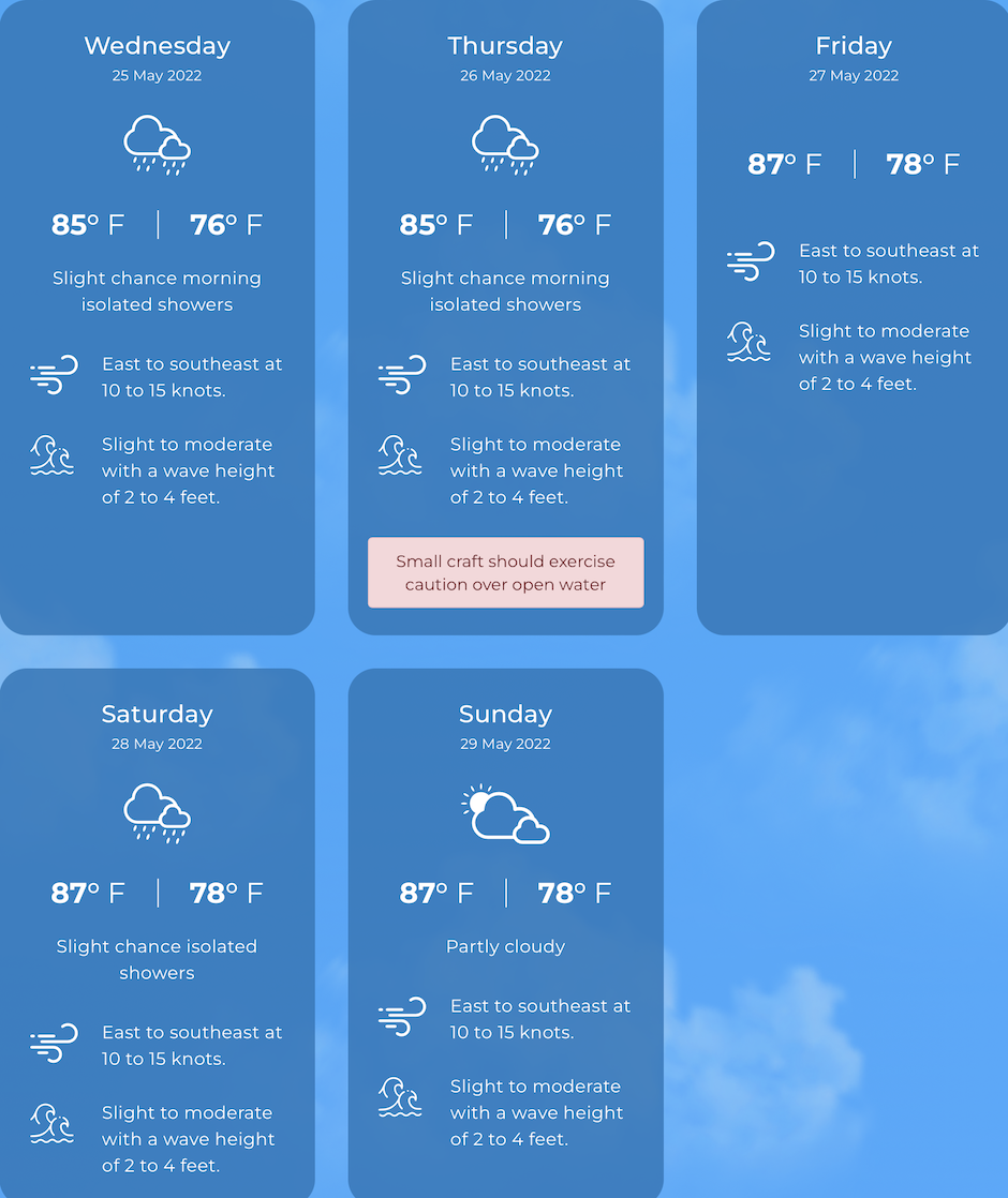 Day: Some sun this morning with increasing clouds this afternoon. Night: A few clouds. Sea: Slight to moderate with a wave height of 2 to 4 feet.