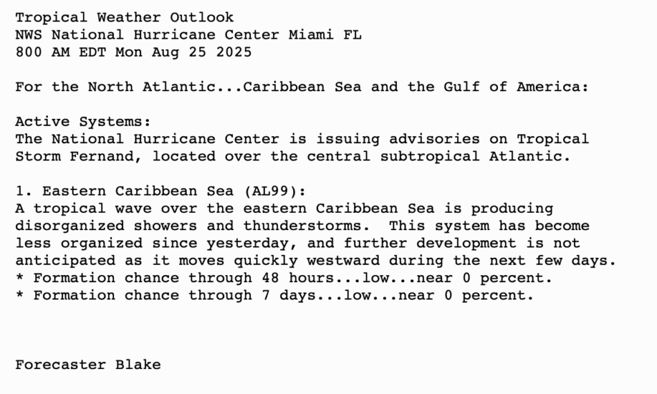 | Tropical Weather Outlook 800 AM EDT Mon 25 Aug 2025 1205 UTC Mon 25 Aug 2025 | |