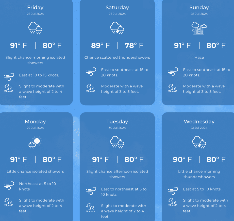 Expected temperatures: 80°F to 91°F. Yesterday: H 90.6°F L 80.1°F