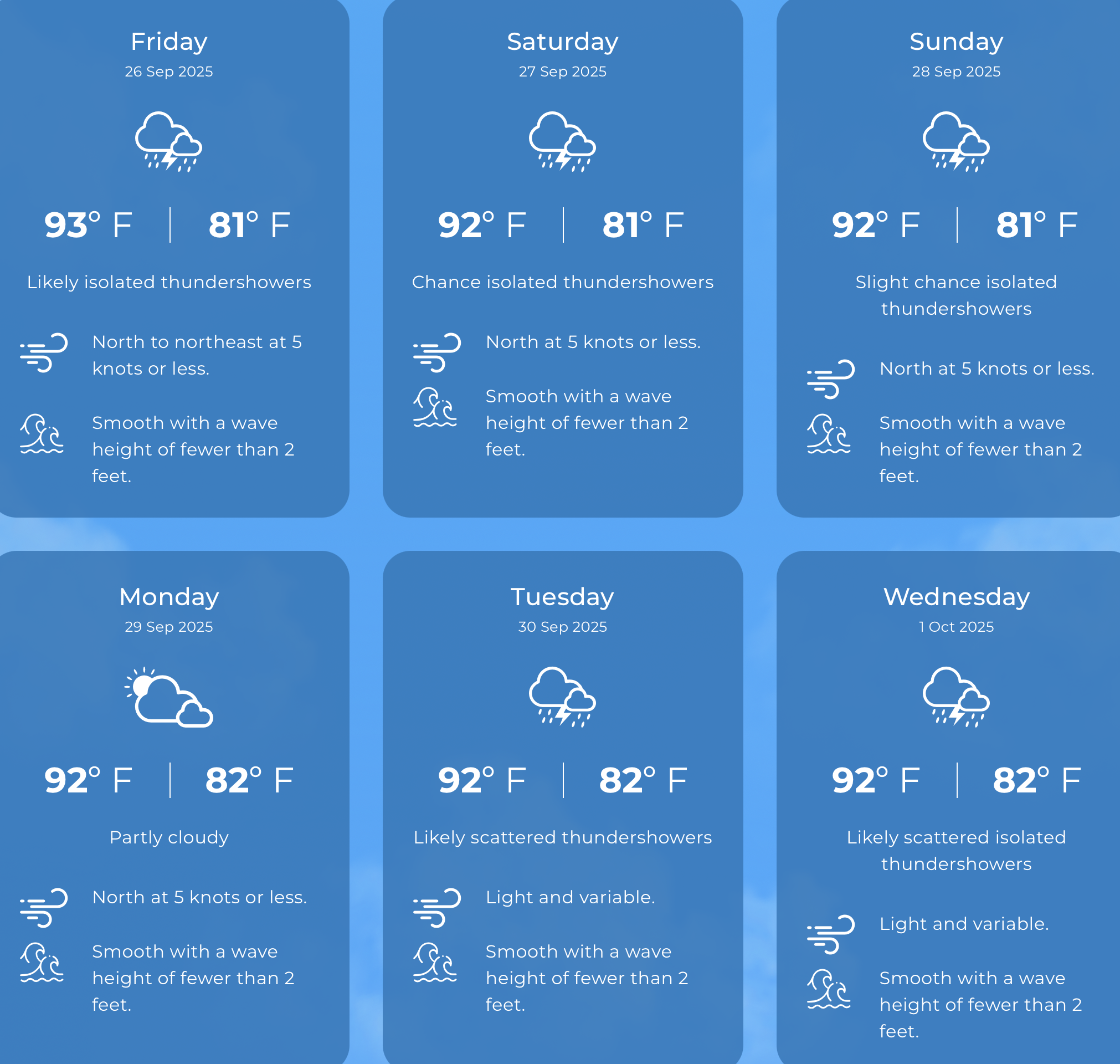 Expected temperatures: 82°F to 93°F. Yesterday: H 92.1°F L 83.0°F