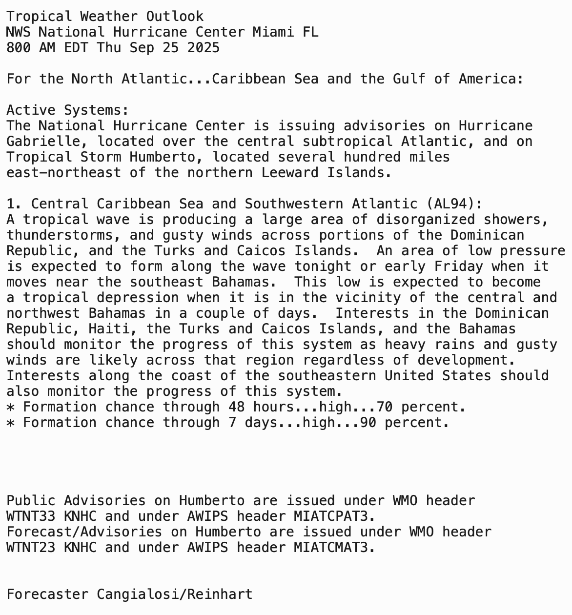| Tropical Weather Outlook 800 AM EDT Thu 25 Sep 2025 1205 UTC Thu 25 Sep 2025 | |