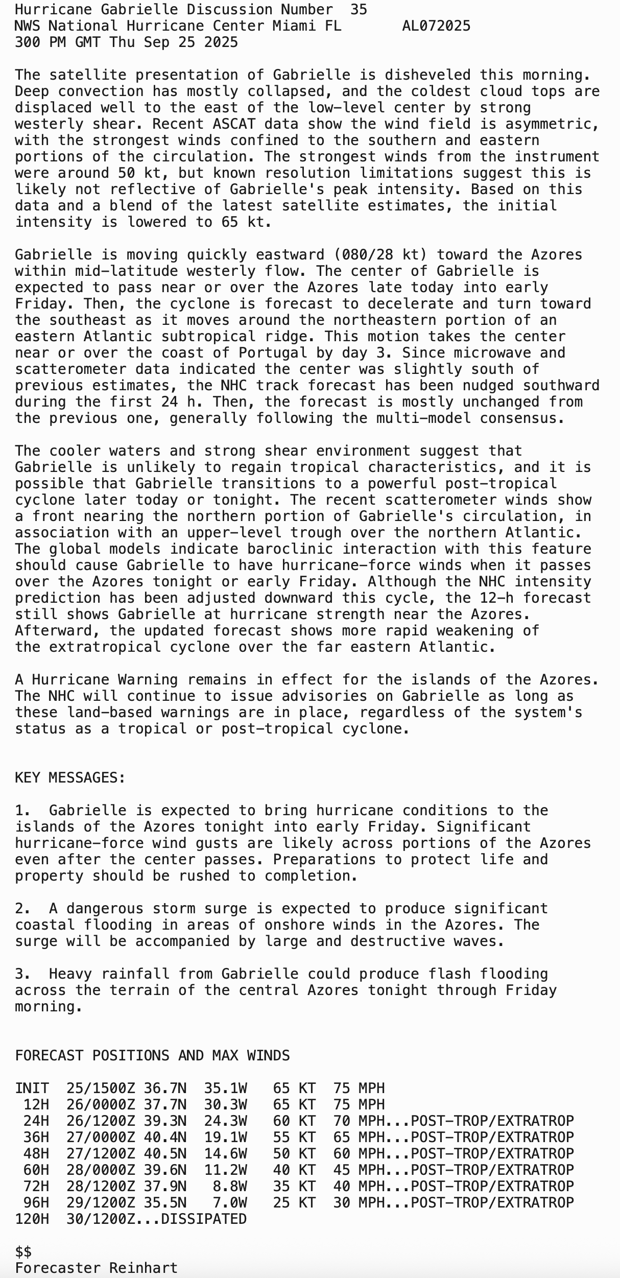 GABRIELLE EXPECTED TO MOVE NEAR OR OVER THE AZORES TONIGHT INTO EARLY FRIDAY… …EXPECTED TO BRING HURRICANE CONDITIONS, A DANGEROUS STORM SURGE, AND LARGE AND DESTRUCTIVE WAVES