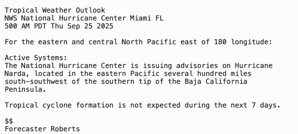| Tropical Weather Outlook 500 AM PDT Thu 25 Sep 2025 1005 UTC Thu 25 Sep 2025 | |