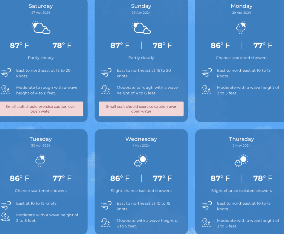Expected temperatures: 78°F to 87°F. Yesterday: H 87.3°F  L 77.9.°F