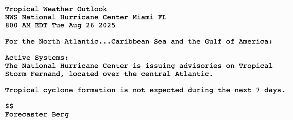 | Tropical Weather Outlook 800 AM EDT Tue 26 Aug 2025 1205 UTC Tue 26 Aug 2025 | |