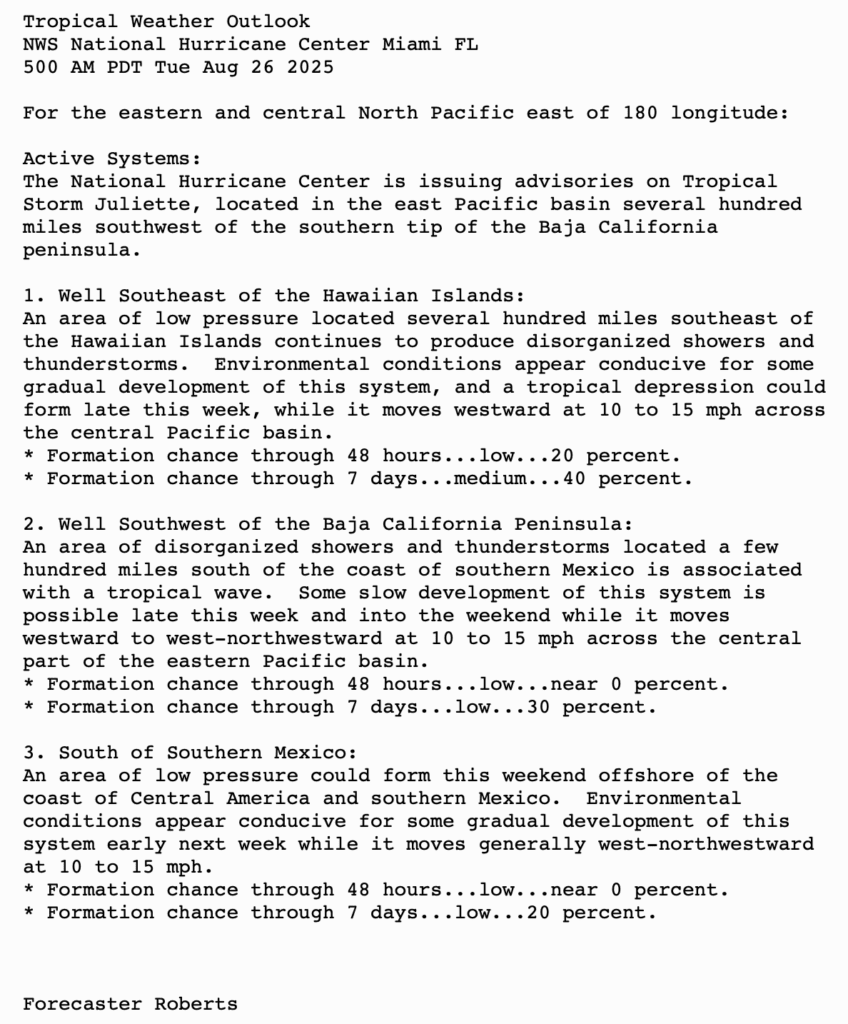 | Tropical Weather Outlook 500 AM PDT Tue 26 Aug 2025 1005 UTC Tue 26 Aug 2025 | |