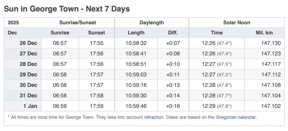Grand Cayman Sun & Tides Tables December 2025
