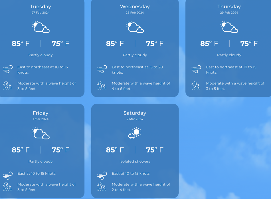 Expected temperatures: 75°F to 85°F. Yesterday: H 83.0°F L 72.7°F