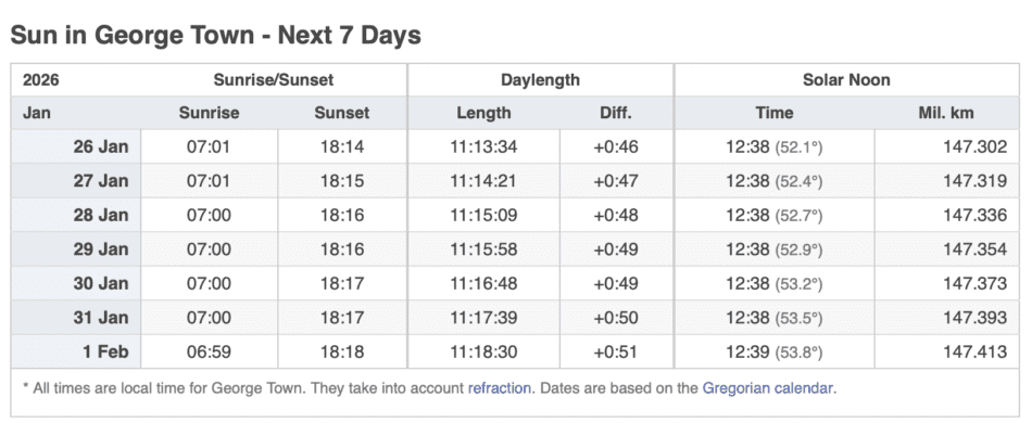 Grand Cayman Sun & Tides Tables January 2026