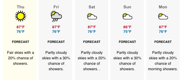 Temperature: Today’s expected temperatures – 67°F to 87°F. Yesterday: H 87.3°F L 71.4°F