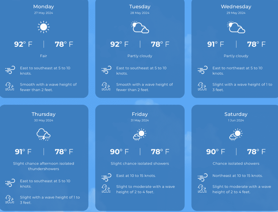 Expected temperatures: 78°F to 92°F. Yesterday: H 91.8°F L 78.2°F