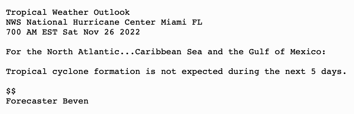 | Tropical Weather Outlook (en Español*) 800 AM EDT Sat Nov 26 2022 1205 UTC Sat Nov 26 2022 | |
