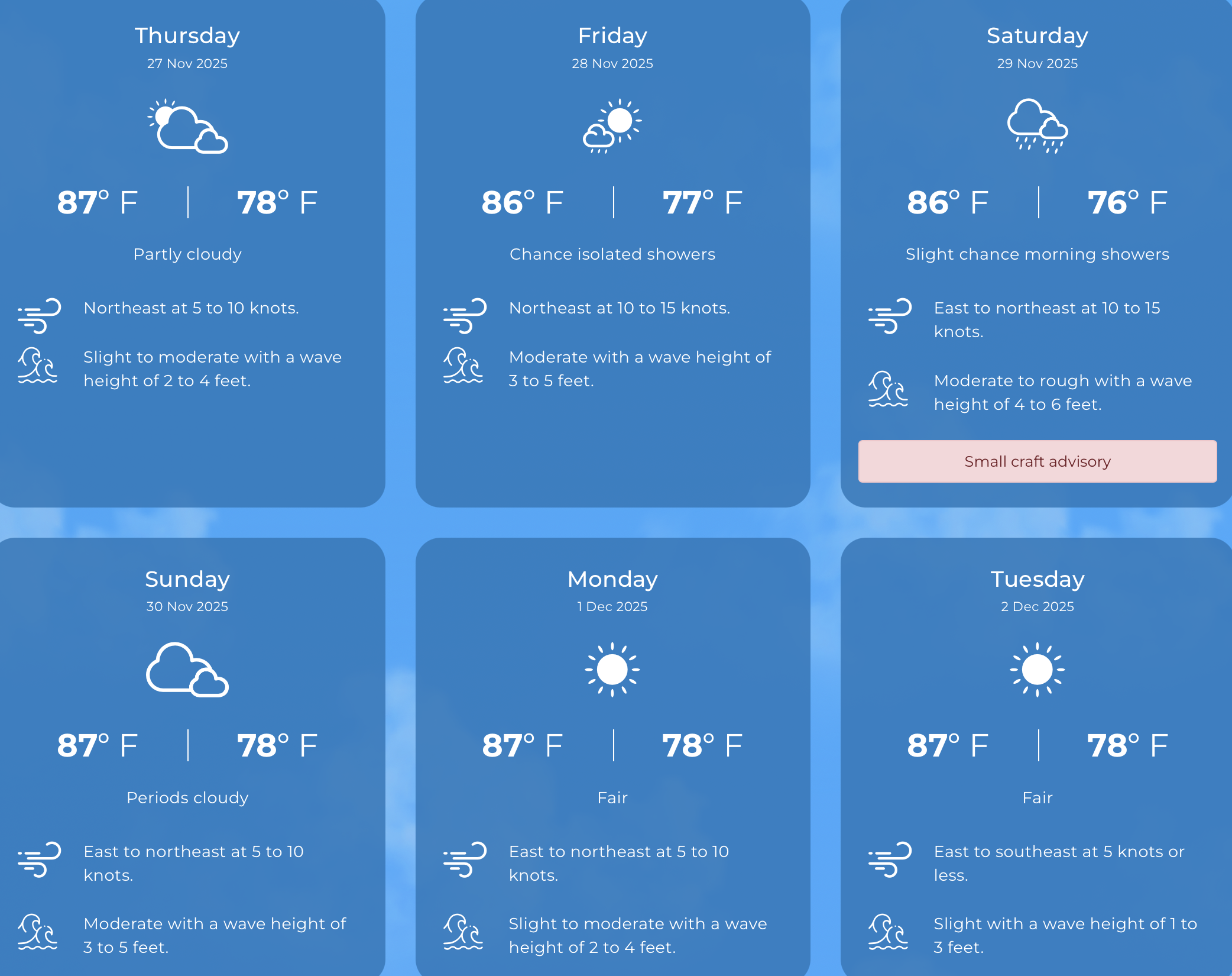 Expected temperatures: 78°F to 87°F. Yesterday: H 87.5°F  L 77.9°F
