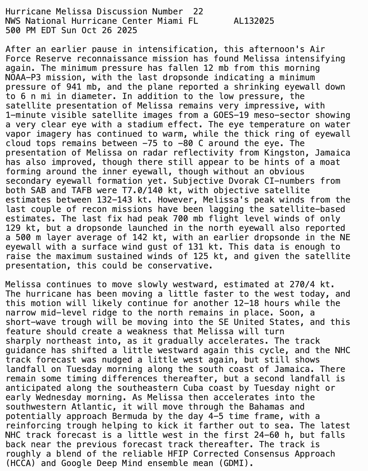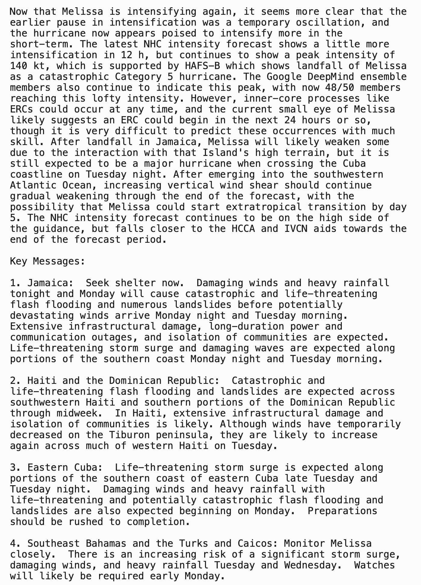 HURRICANE MELISSA RESUMES INTENSIFYING… …LIFE-THREATENING AND CATASTROPHIC FLASH FLOODING AND LANDSLIDES EXPECTED IN PORTIONS OF JAMAICA AND SOUTHERN HISPANIOLA THROUGH MIDWEEK WITH HURRICANE FORCE WINDS LIKELY TO BEGIN TOMORROW-UPDATED 5 PM