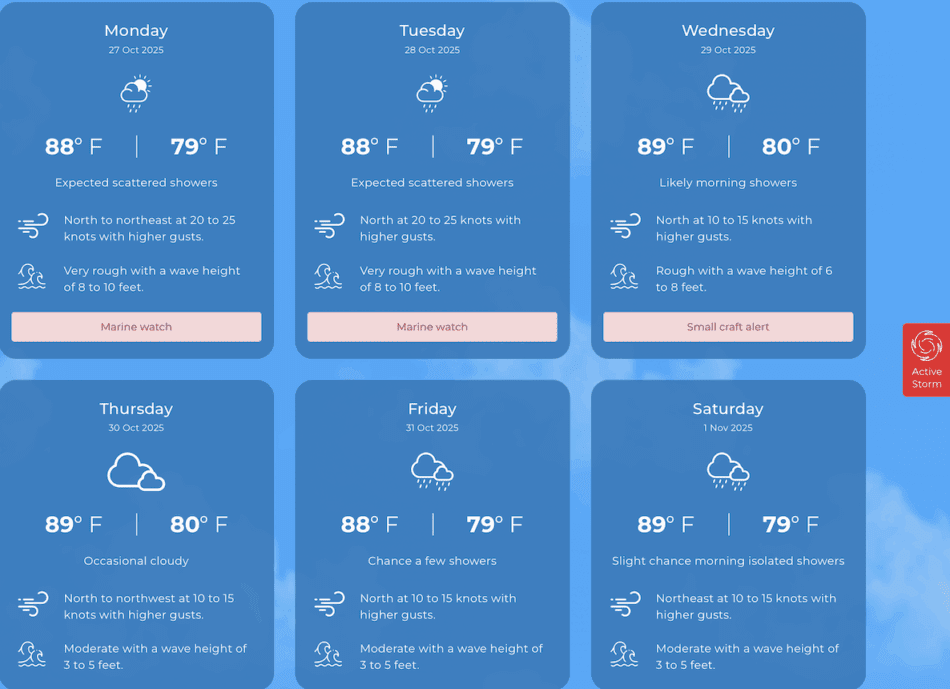 Some showers at times are likely throughout today as feeder bands associated with Hurricane Melissa linger close by and an increase in the frequency of showers, especially across the Sister Islands are expected through Tuesday. Moderate to fresh winds are expected with a gradual increase likely as the pressure gradient remains tightened across the northwest Caribbean.