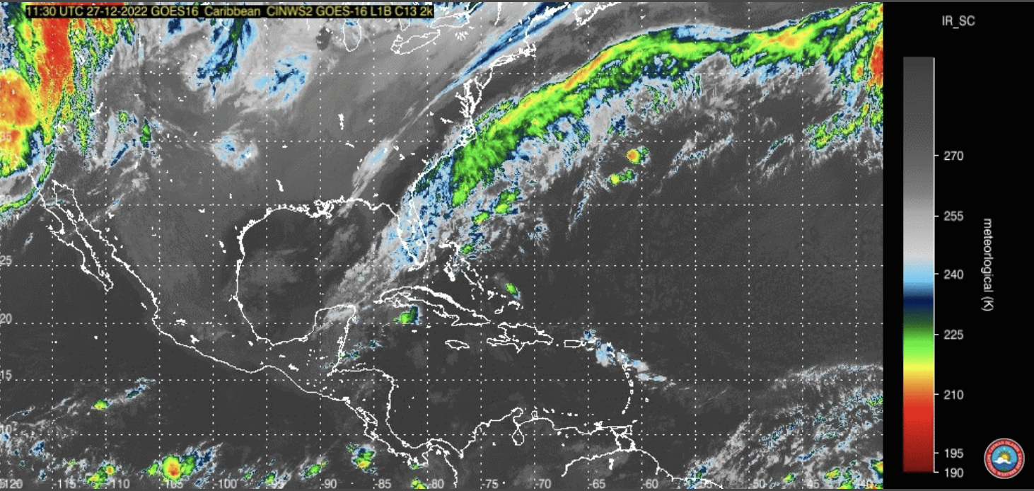 A front currently across central Cuba to NE Honduras has become quasi-stationary but is expected to encroach into the Cayman area during the next 24 hours, where it will linger through Tuesday as it dissipates. This front will support moderate to fresh winds and rough seas over the Cayman area during the next day or two. Radar images show isolated showers in and around the Cayman area moving towards the west.