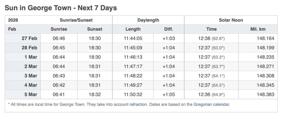 Grand Cayman Sun & Tides Tables February 2026