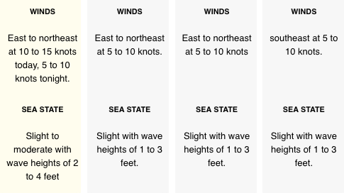 Winds: Today: ENE 10-15 mph. Tonight: E 5-10 mph
