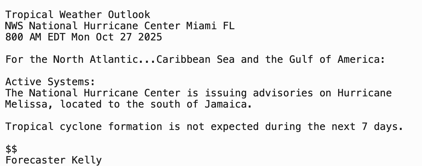 | Tropical Weather Outlook 800 AM EDT Mon 27 Oct 2025 1205 UTC Mon 27 Oct 2025 | |