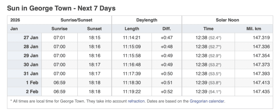 Grand Cayman Sun & Tides Tables January 2026